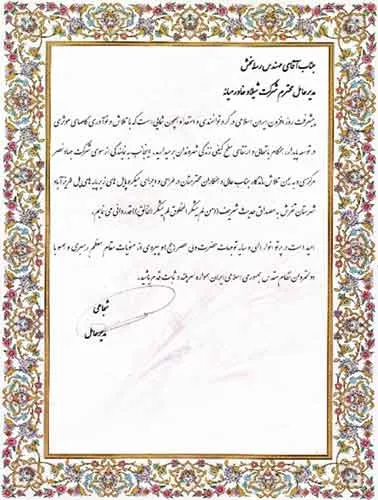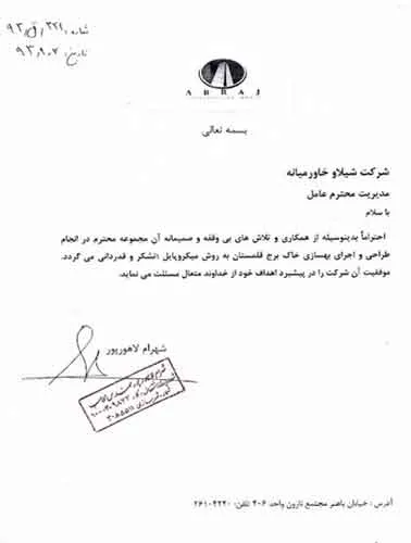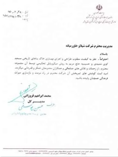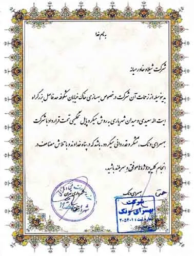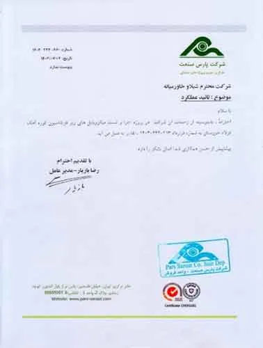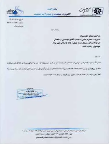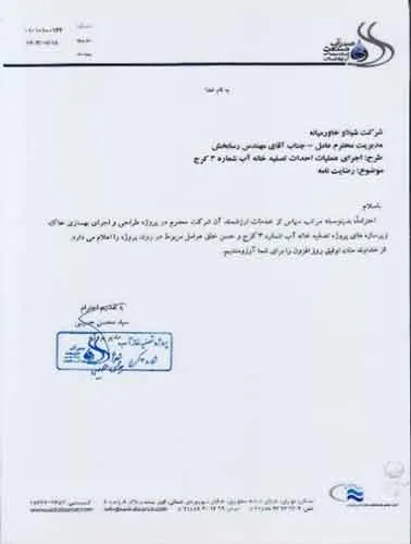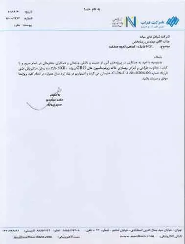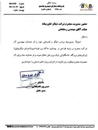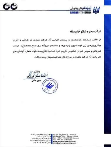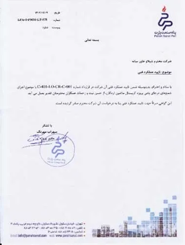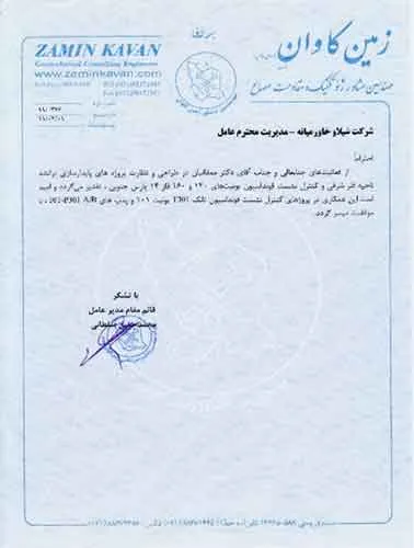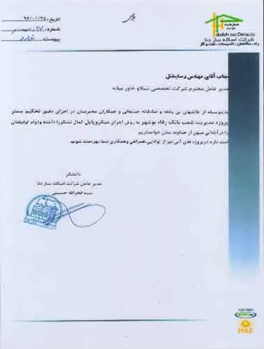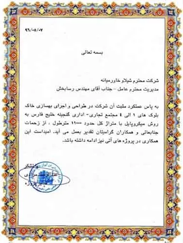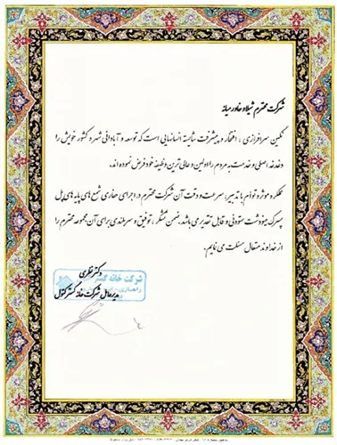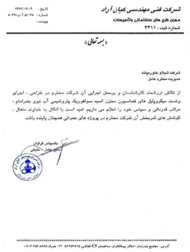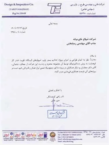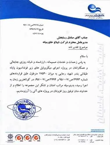 تقدیرنامه ها شرکت ایرانول شرکت پناه صنعت پارت شرکت مجتمع گاز پارس جنوبی شرکت سیف بنا شرکت کیسون بانک کشاورزی شرکت صدرآب صنعت شرکت کیان آراد سازمان میراث فرهنگی، صنایع دستی و گردشگری شرکت طرح و بازرسی شرکت آریانا پترو توان شرکت طرح و بازرسی شرکت خانه گستر کتول شرکت زمین کاوان جنوب شرکت پارس صنعت شرکت خلیج پژم مشارکت گامرون صنعت و صدرآب شرکت جهاد نصر مرکزی شرکت فن آوران شکوه دشتستان مشارکت فراب و ناردیس شرکت ابراج شرکت اسکله ساز دنا شرکت کیان آراد شرکت بهسرای ونک